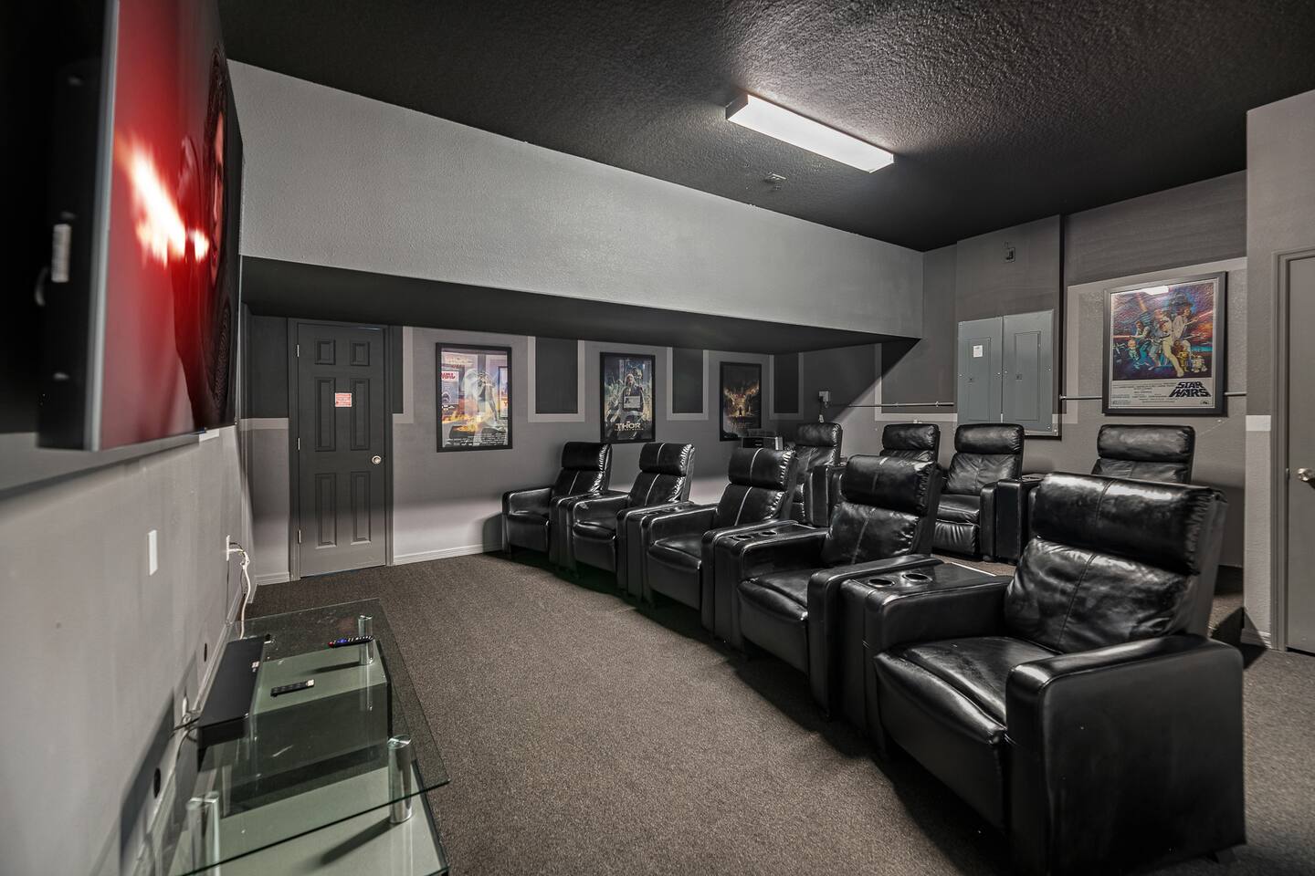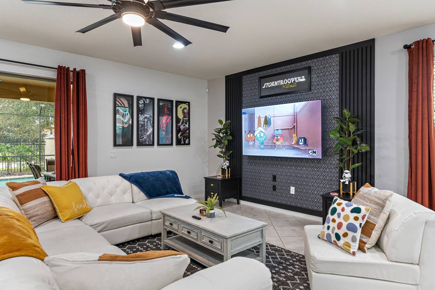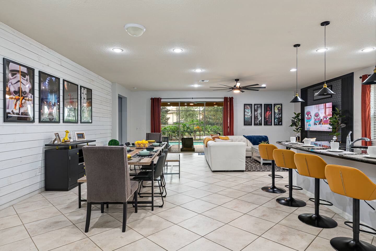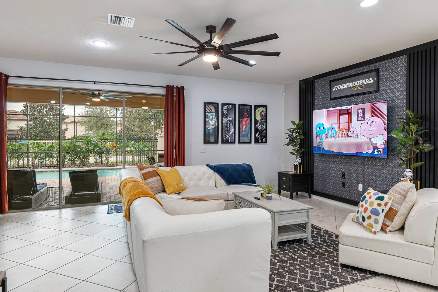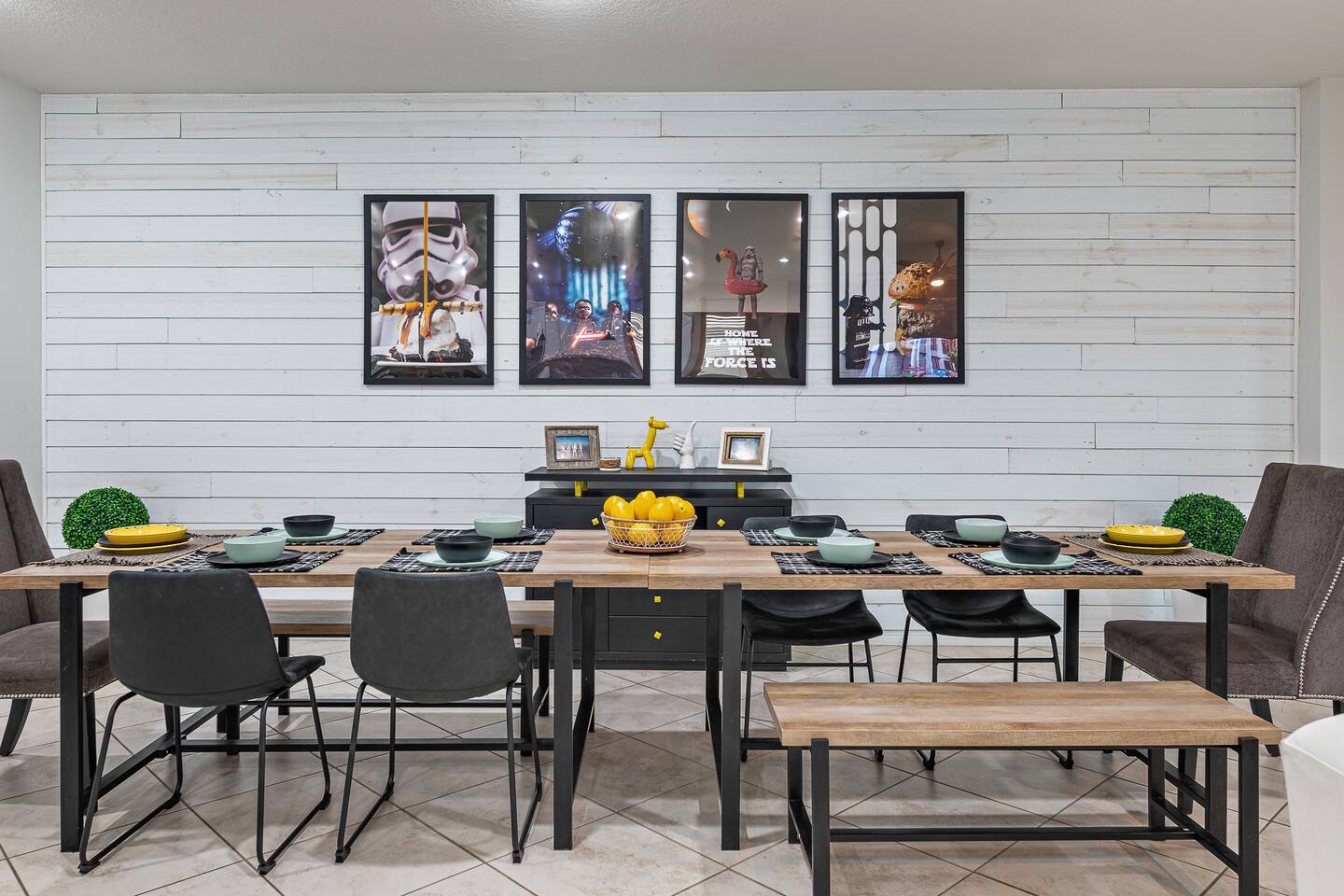 **The Stormtrooper’s Retreat – Closest Stronghold to the Resort** Welcome to the Dark Side. Step into a galaxy far, far away at our Star Wars Dark Side themed 8-bedroom luxury estate. Inspired by the Sith and the Galactic Empire, this professionally renovated home immerses you in a bold, cinematic atmosphere from the moment you arrive. Dramatic décor and high-end finishes create a stay worthy of an emperor. Strategically positioned as the closest rental to the resort amenities, you are just a 2-minute walk across the street from the lagoon-style pool, lazy river, and cantina. After a day conquering the parks, return to your private stronghold to unwind with luxury bedding, fresh linens, and premium mattresses. Home Highlights: Private, screened-in pool and hot tub (Pool and spa heat available for $35/day) In-home movie theater for epic saga marathons Second living room with a pool table Two expansive living room areas for your group to gather 10 Roku Smart TVs for streaming your favorite content High-speed Wi-Fi (400mbps download) Fully equipped kitchen with new cookware Dual-zone central air conditioning Sleeping Quarters: Main Level Primary Suite: King bed with a grand soaking tub and walk-in shower. Main Level Queen Chamber: Queen bed with an adjoining bathroom. Upper Level King Suite II: King bed with a private bathroom. Upper Level King Suite III: King bed with a private bathroom. Upper Level King Chamber IV: King bed with a shared bathroom. Upper Level Chamber VI: Full bed and a Twin bed. Upper Level Chamber VII: Two Twin beds. Upper Level Bunk Chamber: Full-over-Twin bunk beds. Family-Friendly Amenities: We welcome even the smallest recruits with a high chair, two Pack ’n Plays, a baby gate, and a selection of children's books and toys.