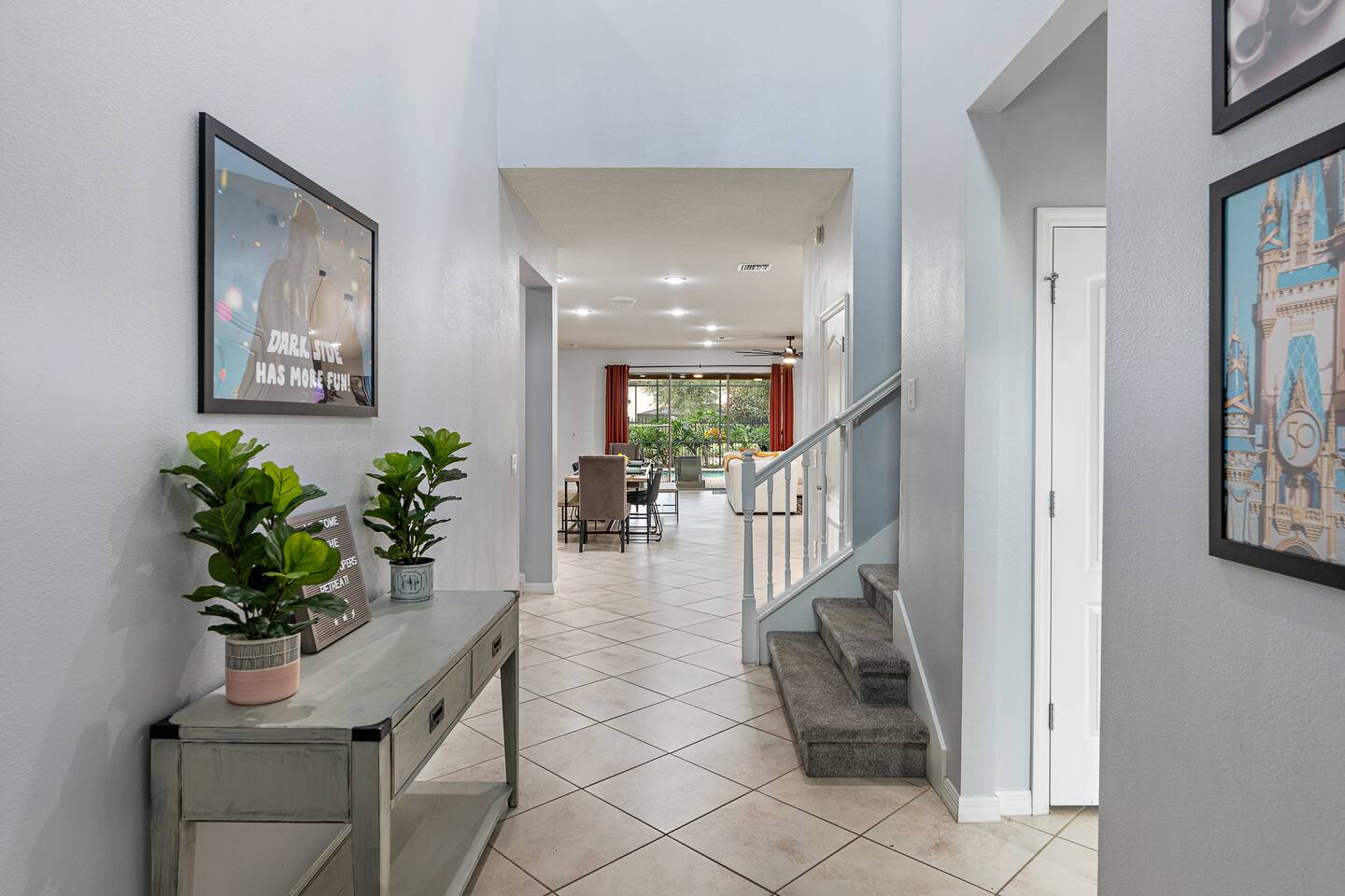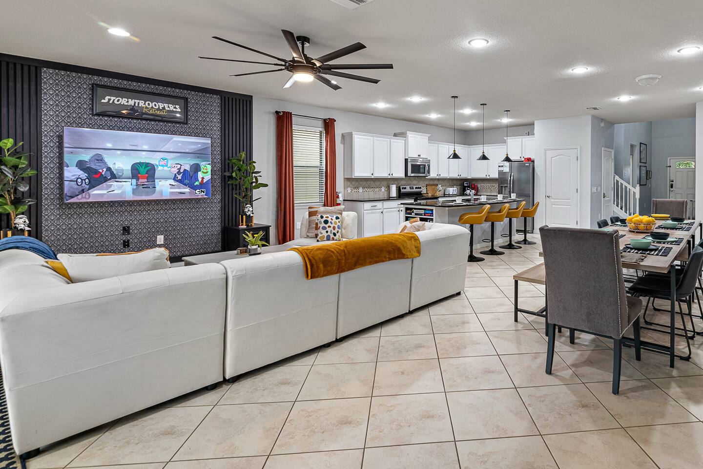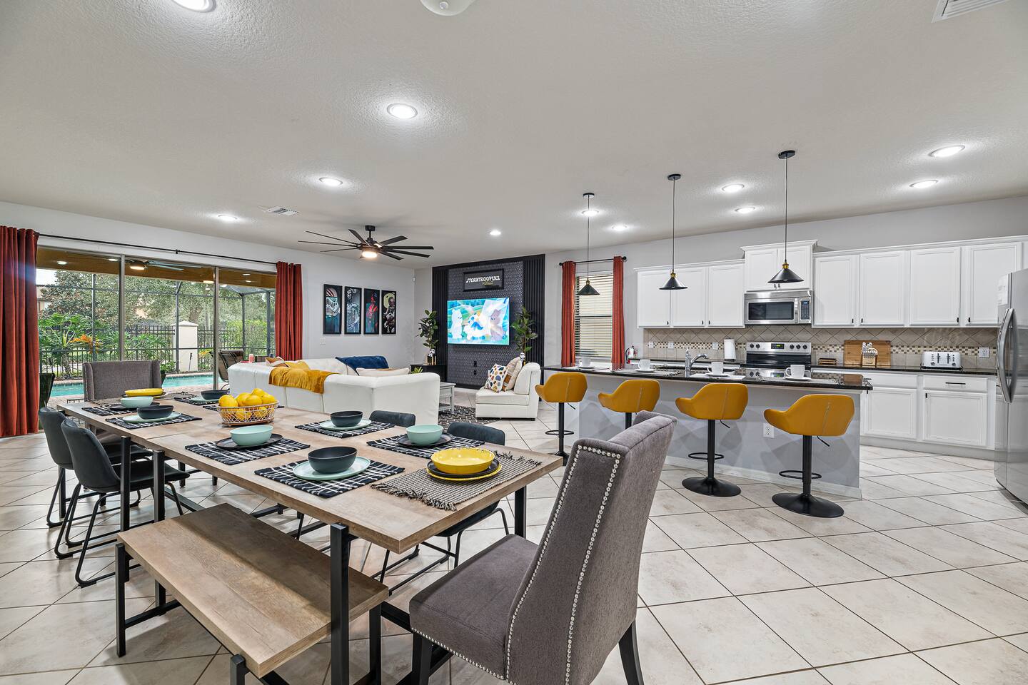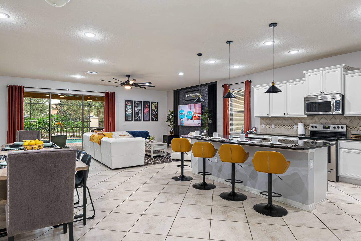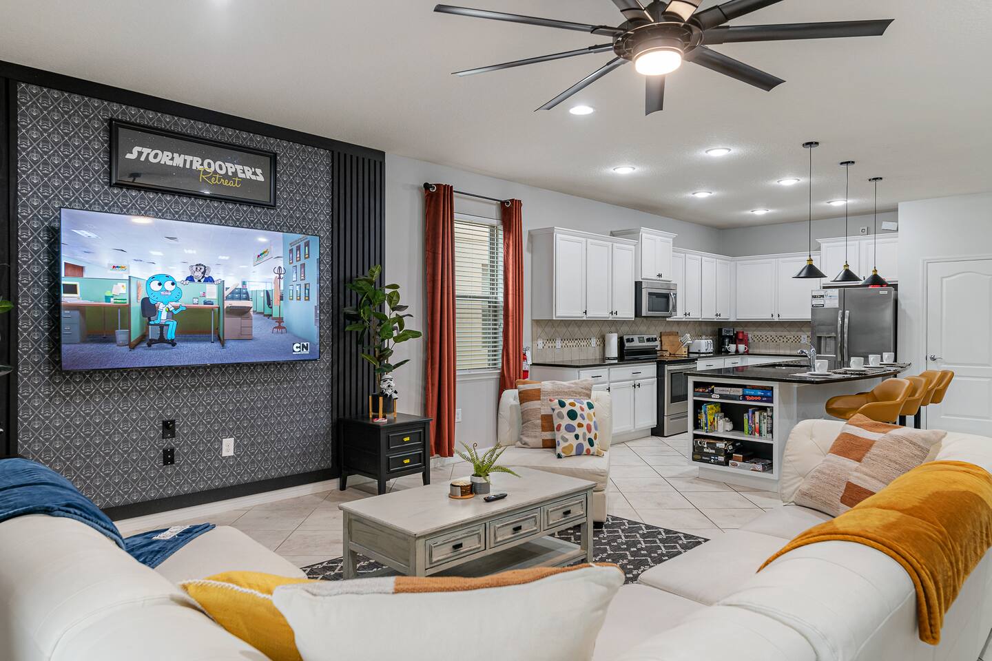 **The Stormtrooper’s Retreat – Closest Stronghold to the Resort** Welcome to the Dark Side. Step into a galaxy far, far away at our Star Wars Dark Side themed 8-bedroom luxury estate. Inspired by the Sith and the Galactic Empire, this professionally renovated home immerses you in a bold, cinematic atmosphere from the moment you arrive. Dramatic décor and high-end finishes create a stay worthy of an emperor. Strategically positioned as the closest rental to the resort amenities, you are just a 2-minute walk across the street from the lagoon-style pool, lazy river, and cantina. After a day conquering the parks, return to your private stronghold to unwind with luxury bedding, fresh linens, and premium mattresses. Home Highlights: Private, screened-in pool and hot tub (Pool and spa heat available for $35/day) In-home movie theater for epic saga marathons Second living room with a pool table Two expansive living room areas for your group to gather 10 Roku Smart TVs for streaming your favorite content High-speed Wi-Fi (400mbps download) Fully equipped kitchen with new cookware Dual-zone central air conditioning Sleeping Quarters: Main Level Primary Suite: King bed with a grand soaking tub and walk-in shower. Main Level Queen Chamber: Queen bed with an adjoining bathroom. Upper Level King Suite II: King bed with a private bathroom. Upper Level King Suite III: King bed with a private bathroom. Upper Level King Chamber IV: King bed with a shared bathroom. Upper Level Chamber VI: Full bed and a Twin bed. Upper Level Chamber VII: Two Twin beds. Upper Level Bunk Chamber: Full-over-Twin bunk beds. Family-Friendly Amenities: We welcome even the smallest recruits with a high chair, two Pack ’n Plays, a baby gate, and a selection of children's books and toys.