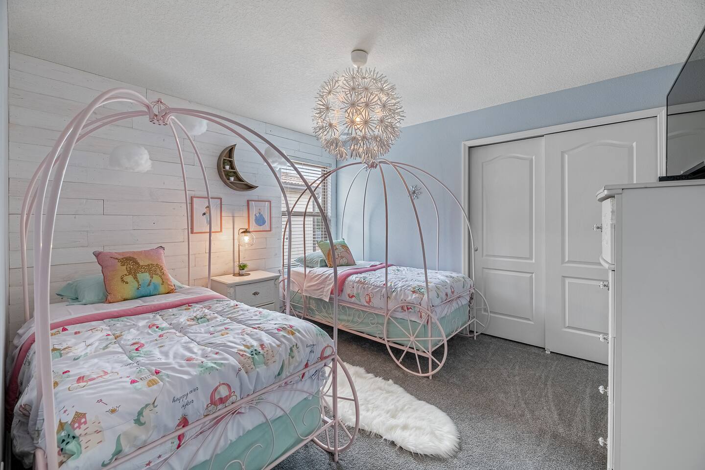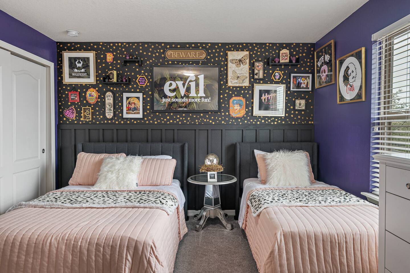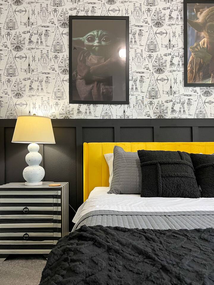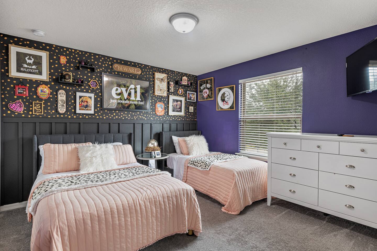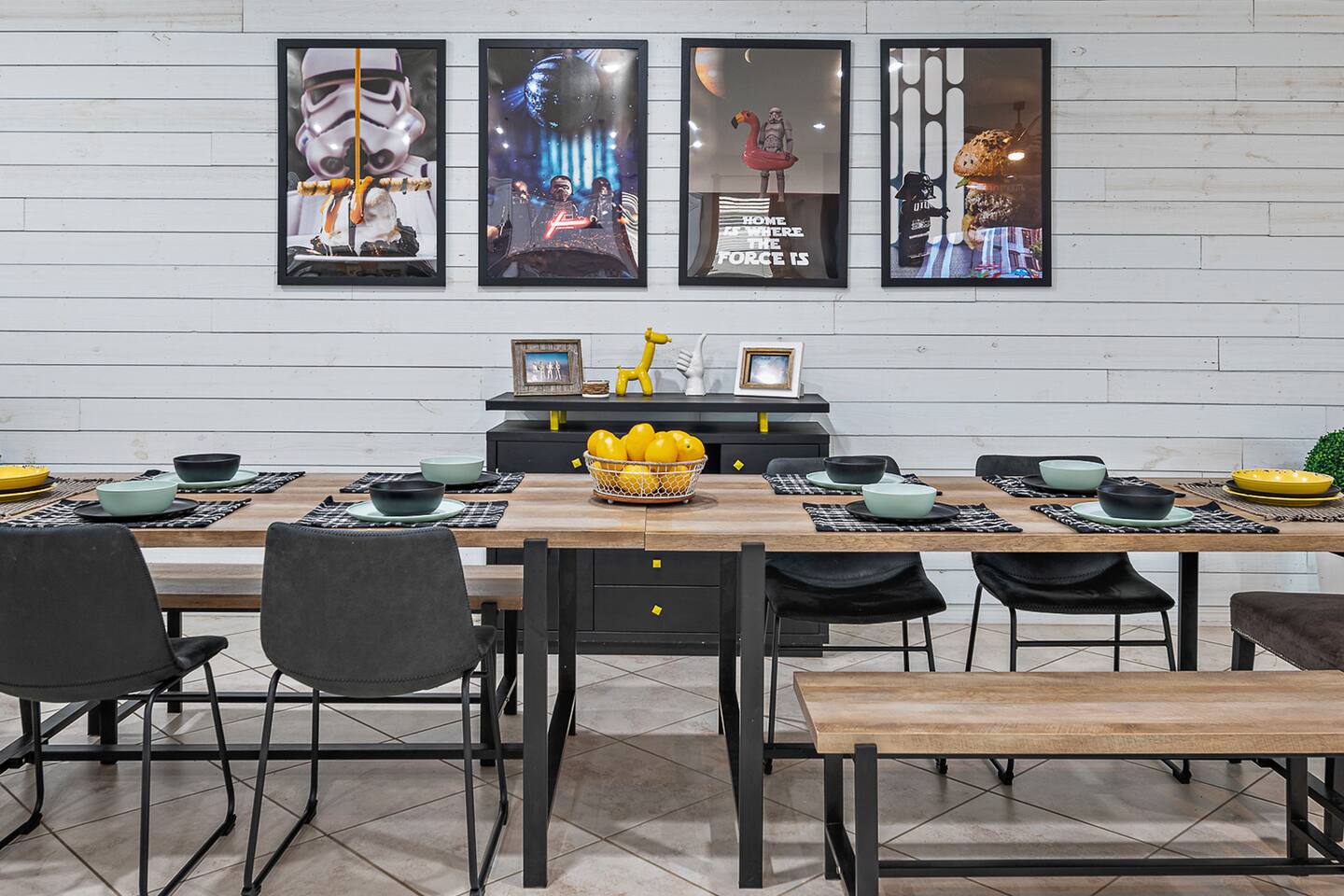 **The Stormtrooper’s Retreat – Closest Stronghold to the Resort** Welcome to the Dark Side. Step into a galaxy far, far away at our Star Wars Dark Side themed 8-bedroom luxury estate. Inspired by the Sith and the Galactic Empire, this professionally renovated home immerses you in a bold, cinematic atmosphere from the moment you arrive. Dramatic décor and high-end finishes create a stay worthy of an emperor. Strategically positioned as the closest rental to the resort amenities, you are just a 2-minute walk across the street from the lagoon-style pool, lazy river, and cantina. After a day conquering the parks, return to your private stronghold to unwind with luxury bedding, fresh linens, and premium mattresses. Home Highlights: Private, screened-in pool and hot tub (Pool and spa heat available for $35/day) In-home movie theater for epic saga marathons Second living room with a pool table Two expansive living room areas for your group to gather 10 Roku Smart TVs for streaming your favorite content High-speed Wi-Fi (400mbps download) Fully equipped kitchen with new cookware Dual-zone central air conditioning Sleeping Quarters: Main Level Primary Suite: King bed with a grand soaking tub and walk-in shower. Main Level Queen Chamber: Queen bed with an adjoining bathroom. Upper Level King Suite II: King bed with a private bathroom. Upper Level King Suite III: King bed with a private bathroom. Upper Level King Chamber IV: King bed with a shared bathroom. Upper Level Chamber VI: Full bed and a Twin bed. Upper Level Chamber VII: Two Twin beds. Upper Level Bunk Chamber: Full-over-Twin bunk beds. Family-Friendly Amenities: We welcome even the smallest recruits with a high chair, two Pack ’n Plays, a baby gate, and a selection of children's books and toys.